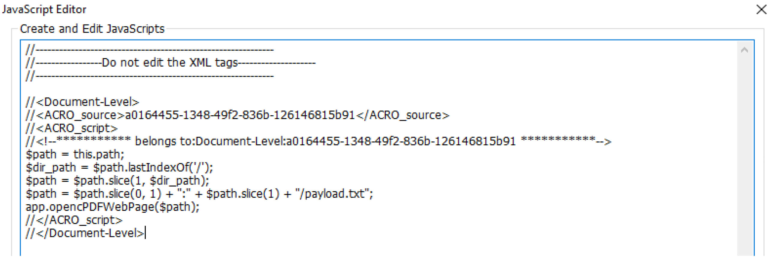لحقن كود JavaScript في ملف PDF، يمكن للمهاجم تعديل ملف محتوى PDF مباشرةً أو استخدام أدوات مثل Foxit Phantom PDF. تحدد الشيفرة البرمجية الضارة مسار الملف الضار وتنفذ التعليمات البرمجية الضارة باستخدام دالة opencPDFWebPage.