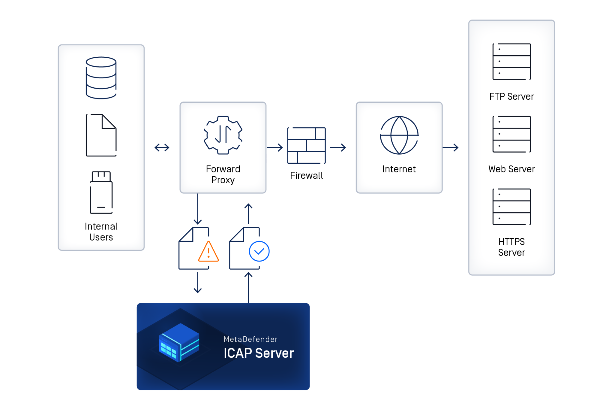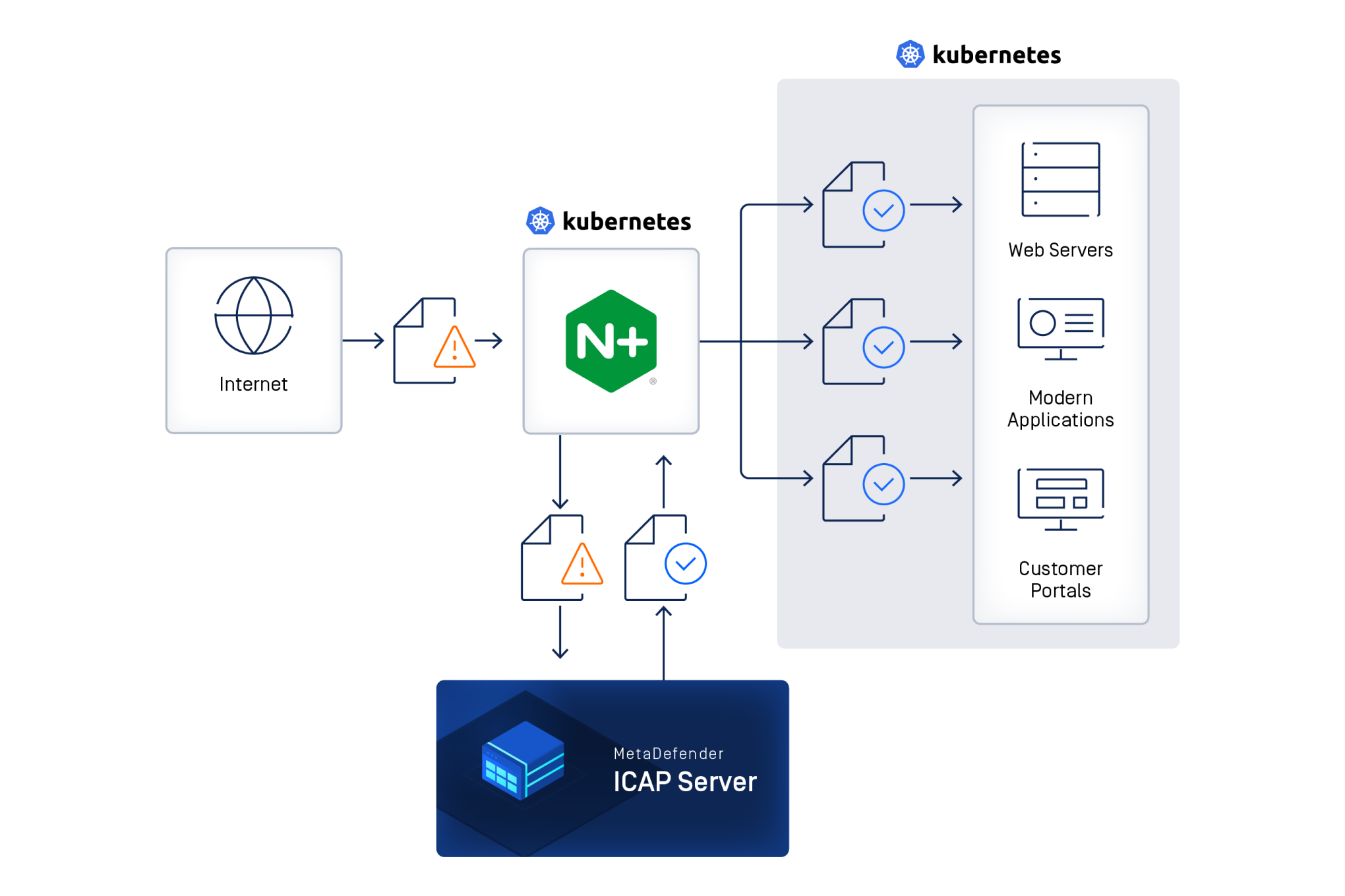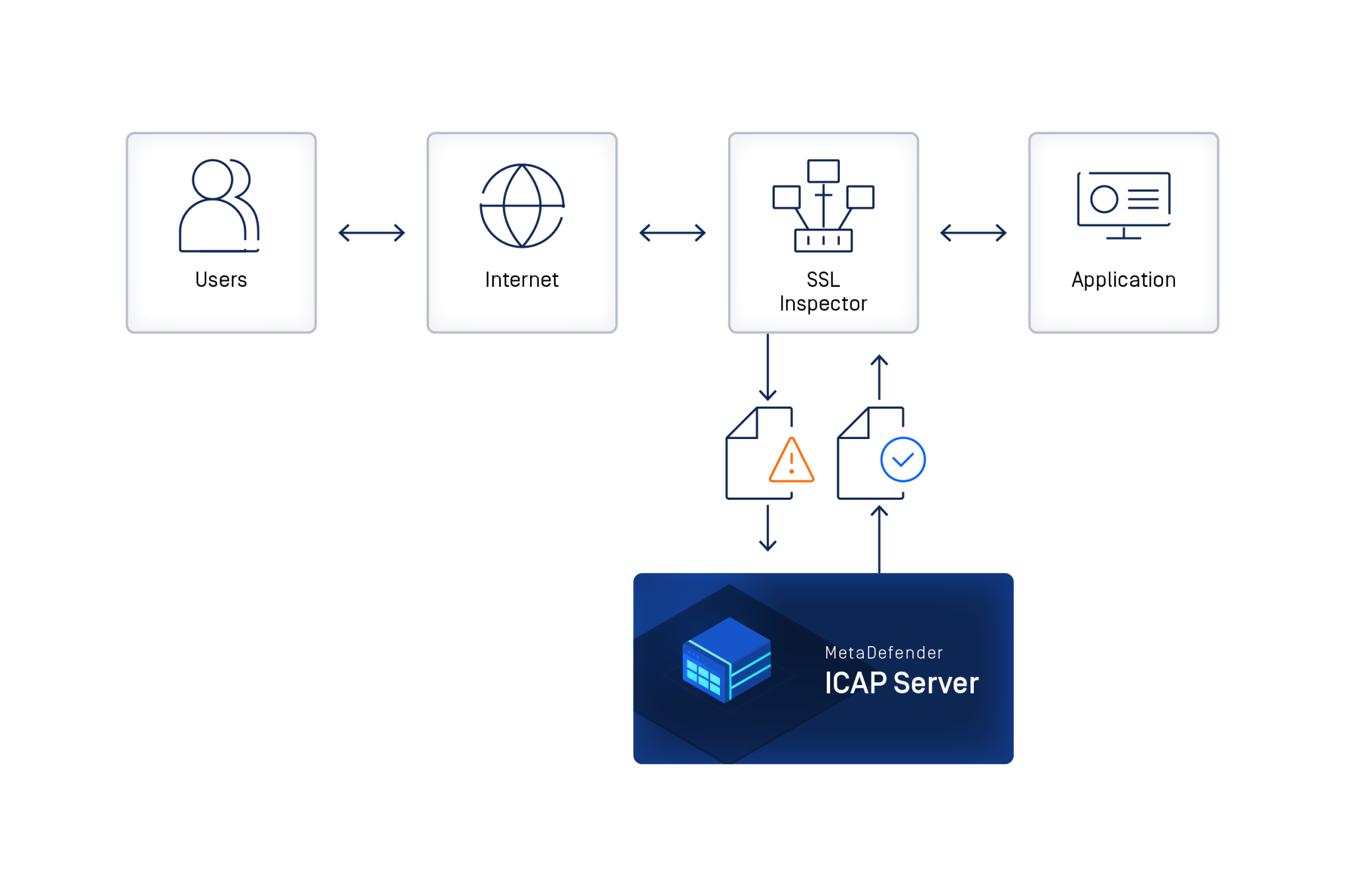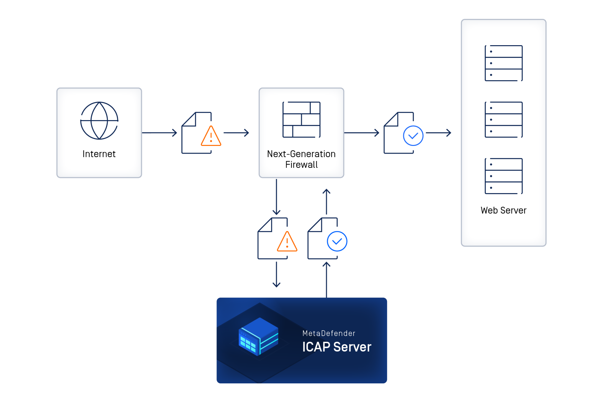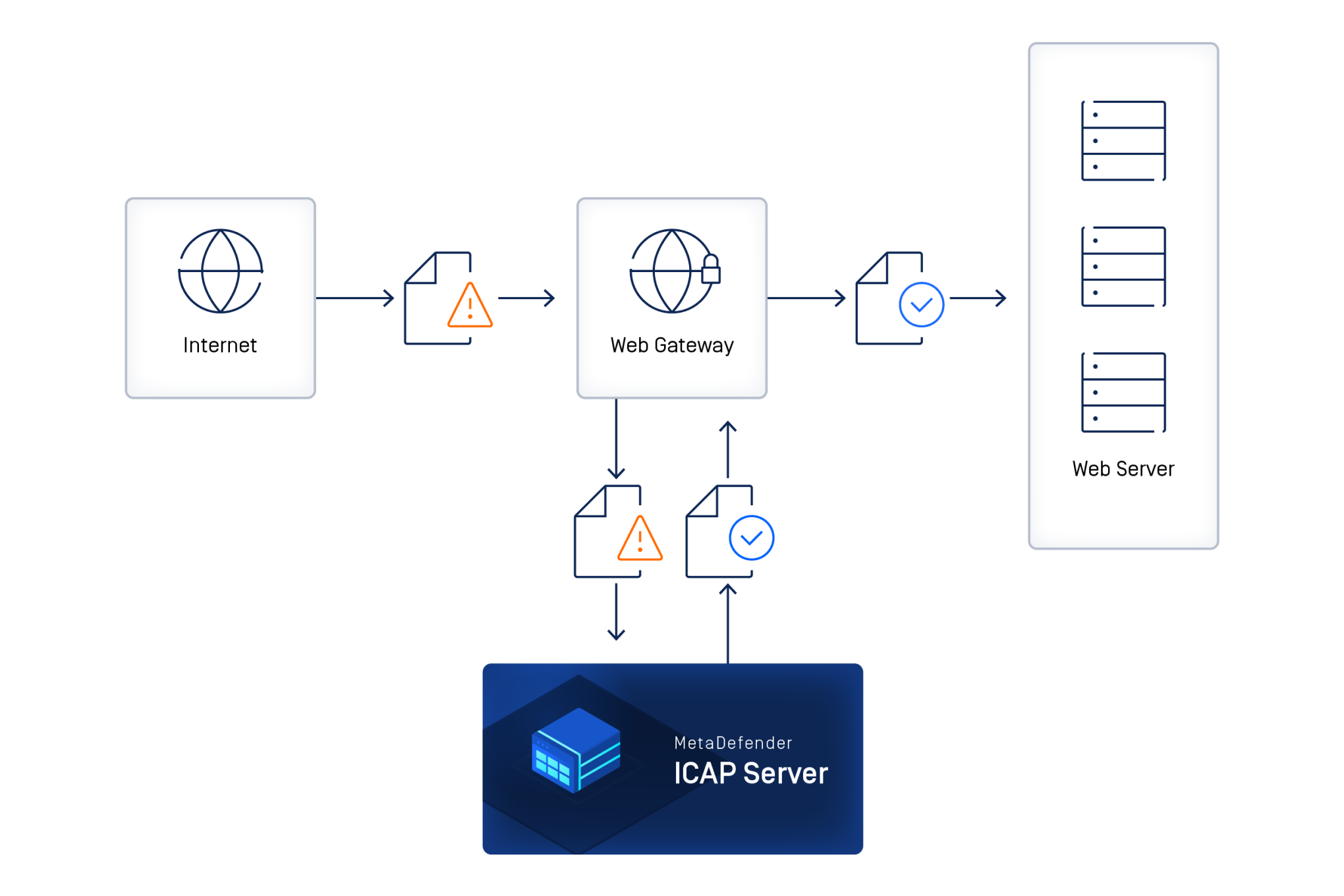 يمكن لمسؤولي النظام إعداد أي وكيل عكسي يتم تنفيذه ICAP لإعادة توجيه أي ملفات تم تحميلها تلقائيا إلى MetaDefender ICAP Server، والذي سيقوم بعد ذلك بفحص الملفات بحثا عن التهديدات ونقاط الضعف بالإضافة إلى تعقيم الملفات.