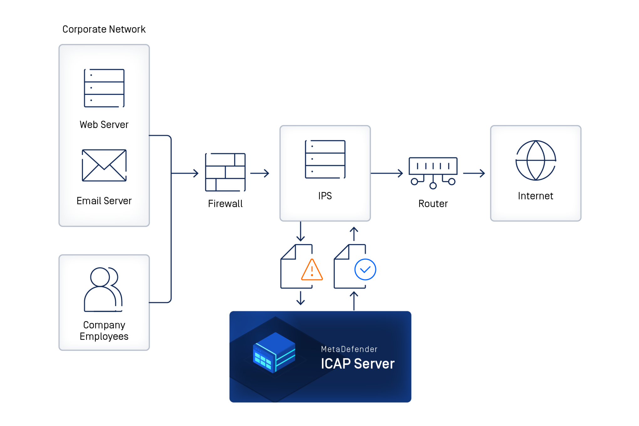 قد تحتوي عمليات نقل الملفات من جهاز نقطة النهاية البعيدة إلى بيئة الخادم على تهديدات قائمة على الملفات. MetaDefender ICAP Server يفحص جميع الملفات المرسلة من شبكة بعيدة قبل تحميلها إلى الخادم الداخلي.
