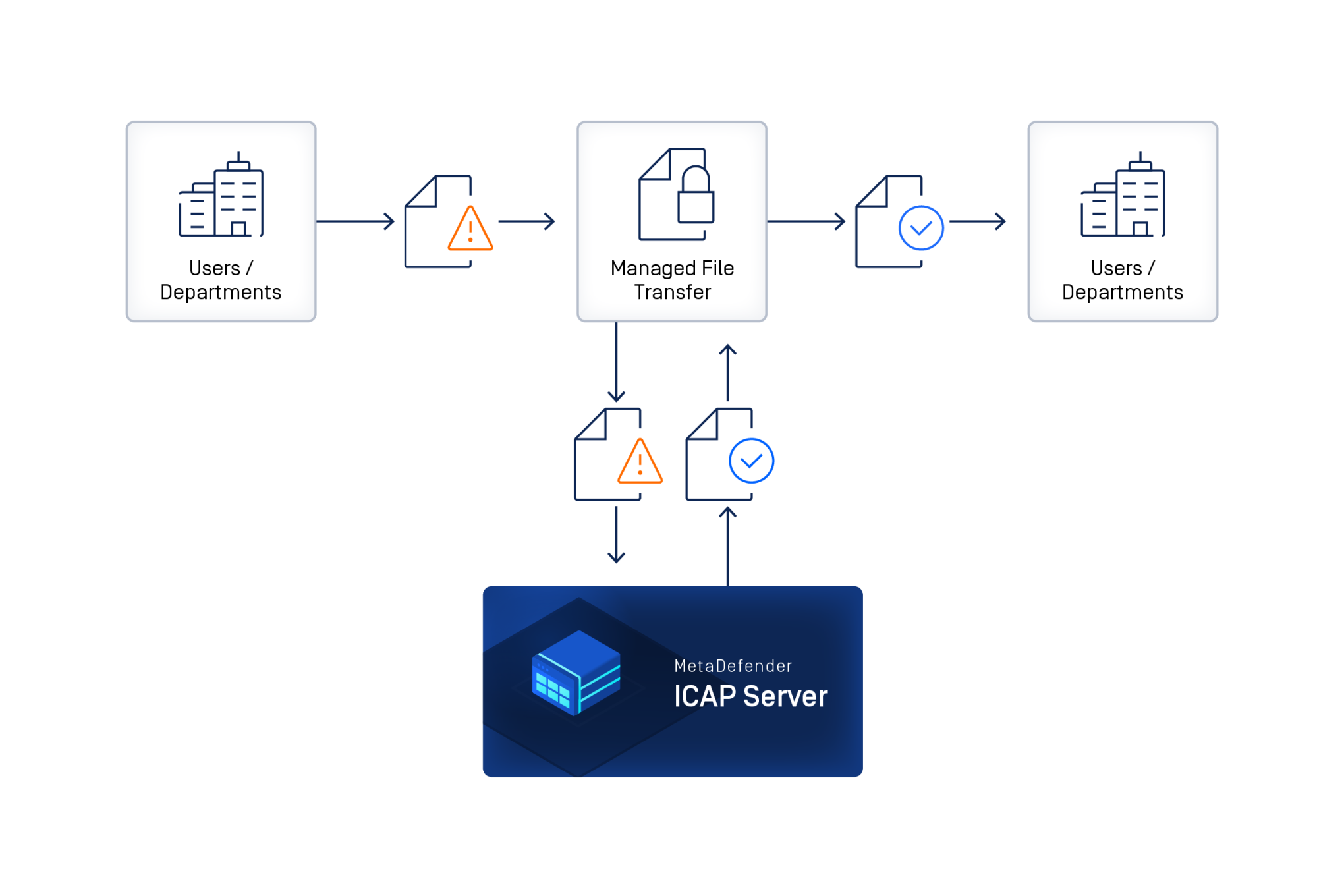 ادماج MetaDefender ICAP Server مع عمليات نقل الملفات المدارة (MFTs) لمسح وتحليل كل محتوى الملف الذي ينتقل عبر MFT عند التحميل أو التنزيل أو السكون.