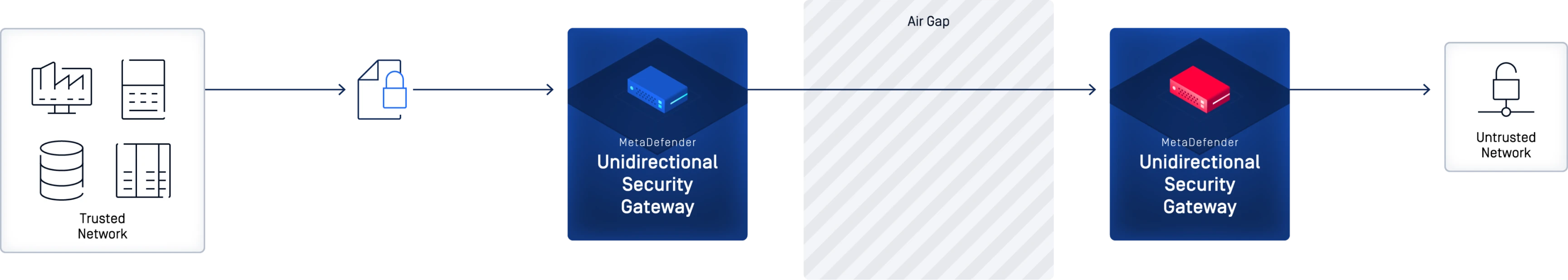 تعملUnidirectional Security Gateway MetaDefender Unidirectional Security Gateway على فرض تدفق البيانات في اتجاه واحد مع ضمان تسليم الحمولة ومنع فقدان البيانات، وتجنب الحاجة إلى إعادة إرسال البيانات.