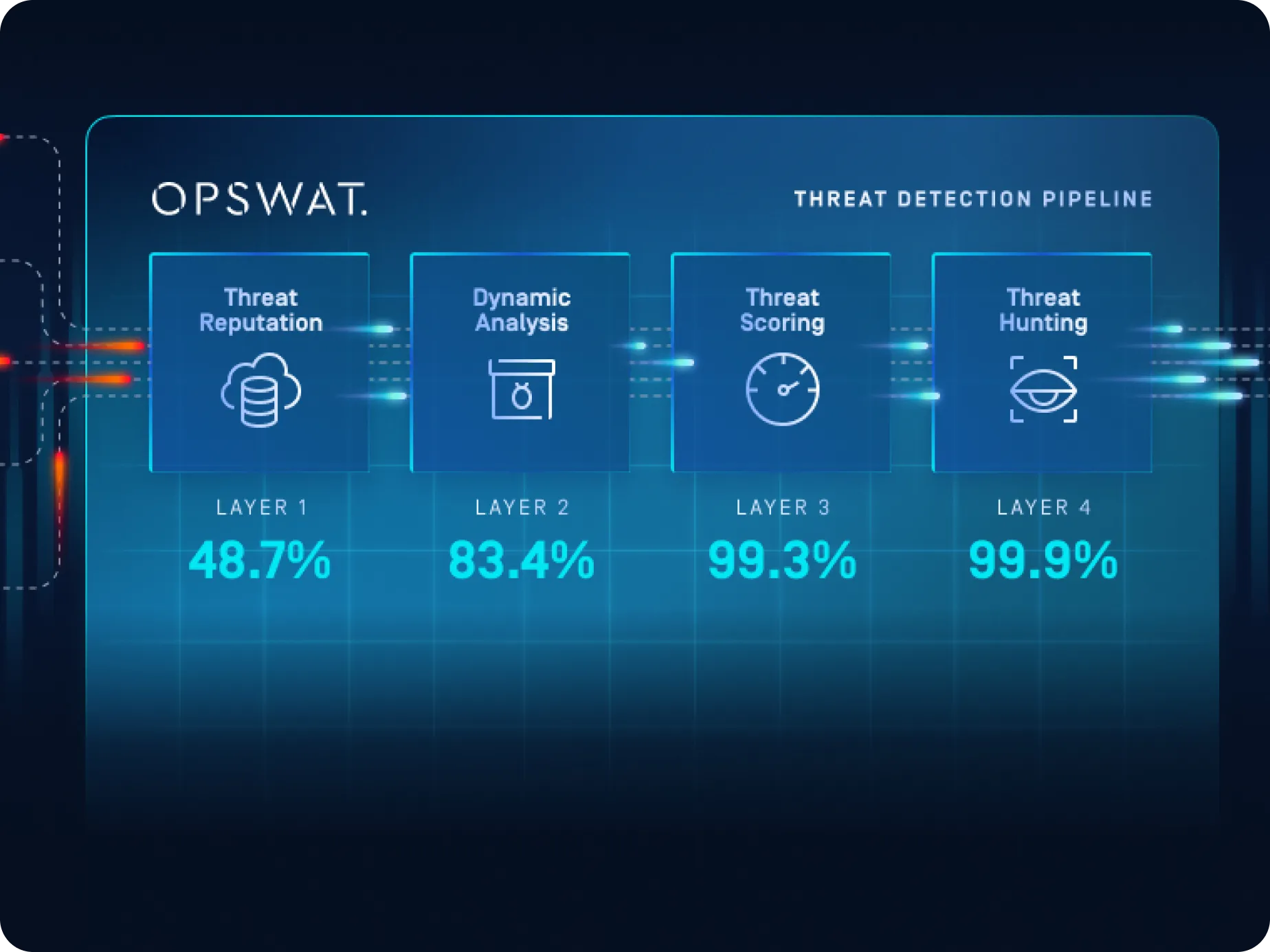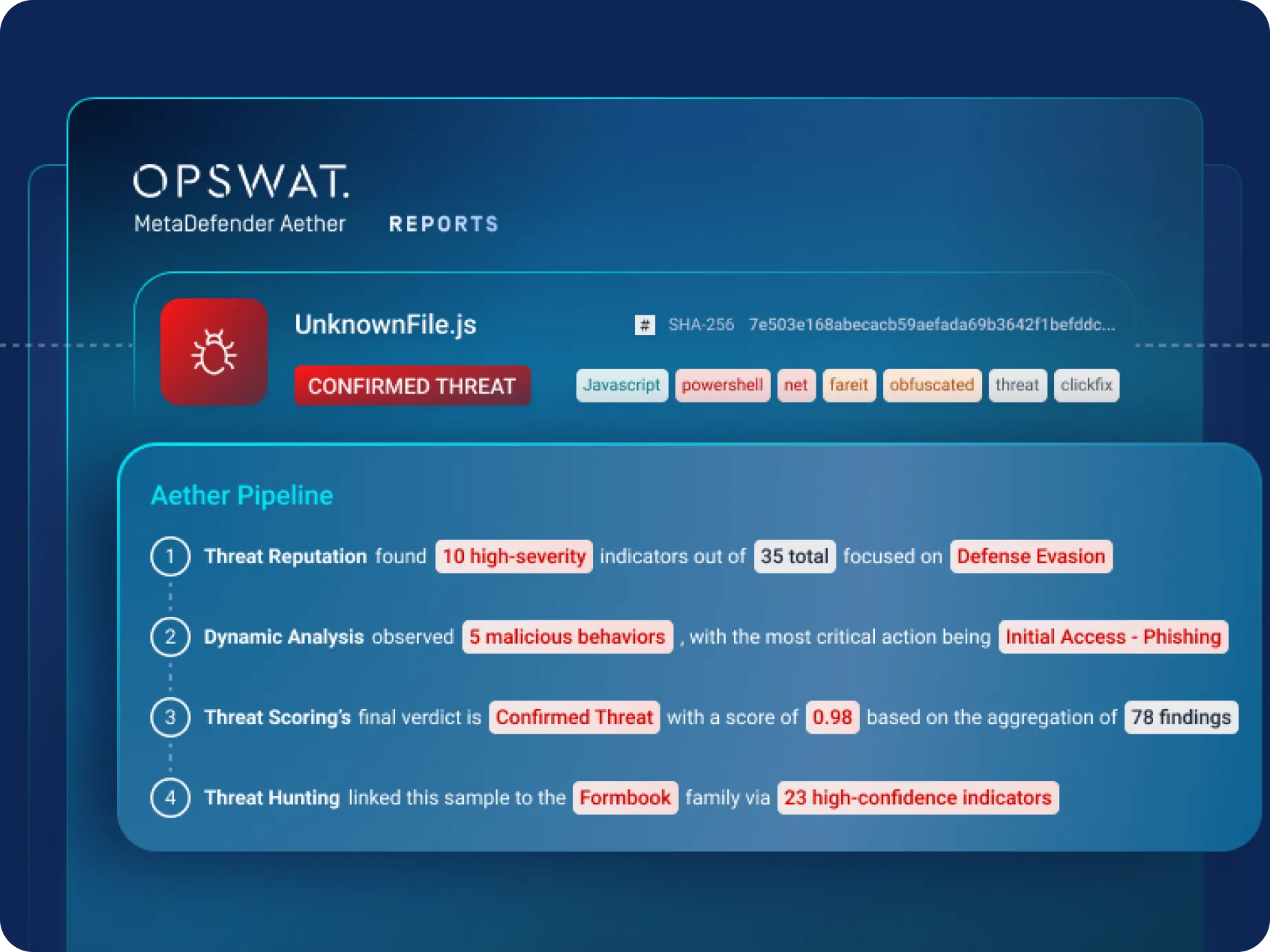 OPSWAT Research & Intelligence Center insights are powered by MetaDefender Aether, a unified four-layer zero-day detection pipeline that combines threat reputation, adaptive sandboxing, threat scoring, and ML-based similarity search to produce a single, consolidated verdict per file.