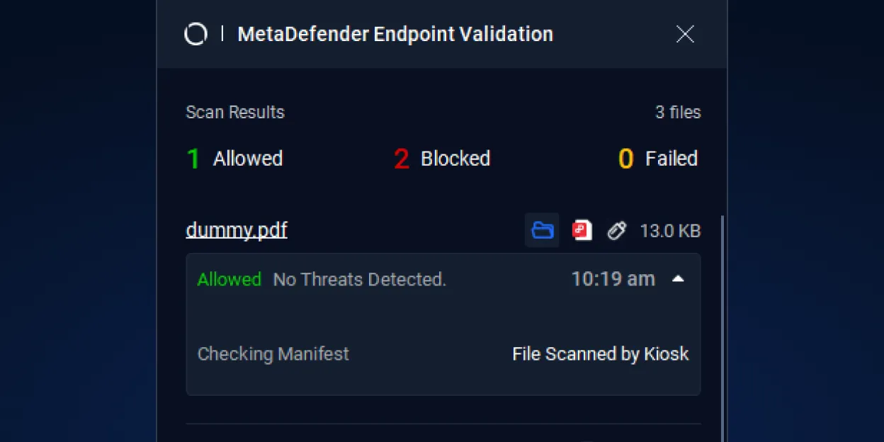 يبدأ أمان الوسائط الملحَقة والقابلة للإزالة مع MetaDefender Kiosk، ويُعزَّز بطبقات الحماية الإضافية هذه، ما يضمن حماية بياناتك وشبكاتك وأصولك المهمة.